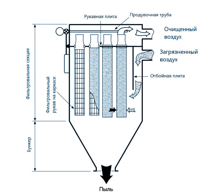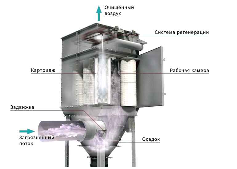 Очищенный газ проходит сквозь поры фильтровального материала и попадает в камеру чистого газа. Концентрация пыли на выходе не превышает 5–10 мг/м³.