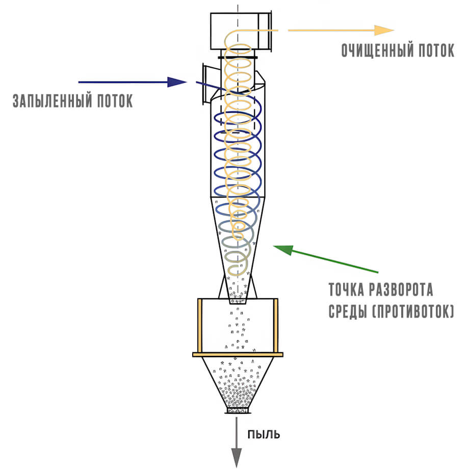 Попадая в бункерную часть фильтра, газовый поток меняет направление. Крупные и тяжелые частицы (размером более 50–100 мкм) под действием силы тяжести осаждаются в бункер, не достигая фильтровальных элементов. Это снижает нагрузку на фильтры и продлевает их ресурс.
